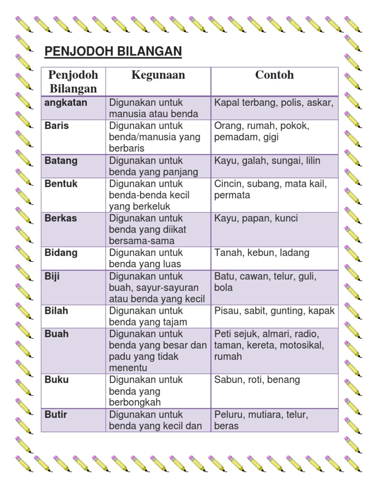 CONTOHNYA SETIAP MURID SELURUH KAMPUNG PENJODOH BILANGAN. Penjodoh bilangan bagi objek yang lurus seperti sungai dan kayu. Latihan 2 Tulis penjodoh bilangan yang betul bagi perkataan bergaris.